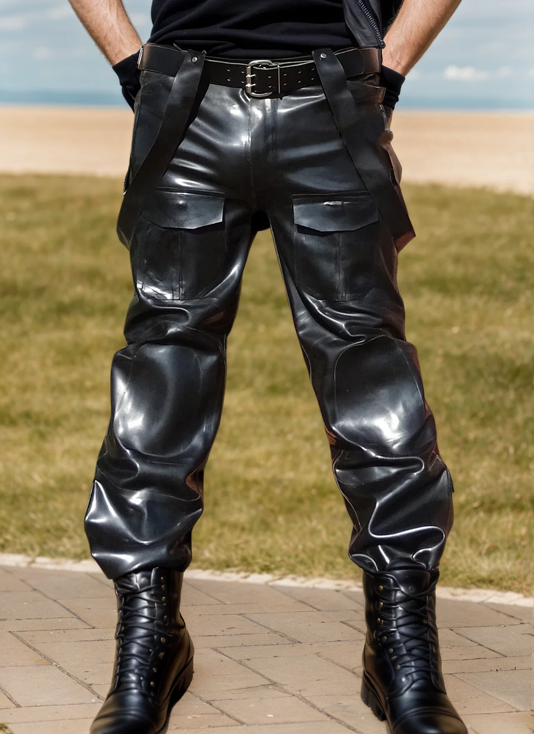 The rigid 1.0 mm latex creates a bold, defined silhouette that drapes uniquely on the body. The heavy material and high-gloss black finish give these pants a commanding presence and a premium feel. The fit is both powerful and sleek, embodying a unique blend of classic aviation style and modern fetish fashion.